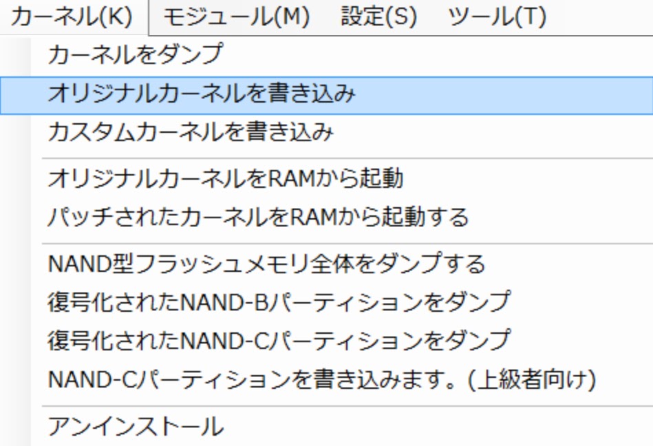 もしオリジナルカーネルの書き込みまでいかなかったら自分でカーネル→オリジナルカーネルを書き込みしてください