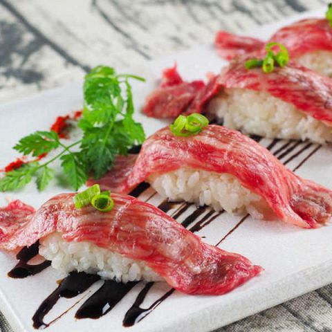 今話題のお肉を和牛のお肉のお寿司です。リーズナブルなお値段で召し上がれるのはここだけ!?お得な三貫★ A5最高ブランド和牛使用。盛り付けもおしゃれで女性に大人気です!!とろける和牛炙りすしをぜひご堪能ください♪