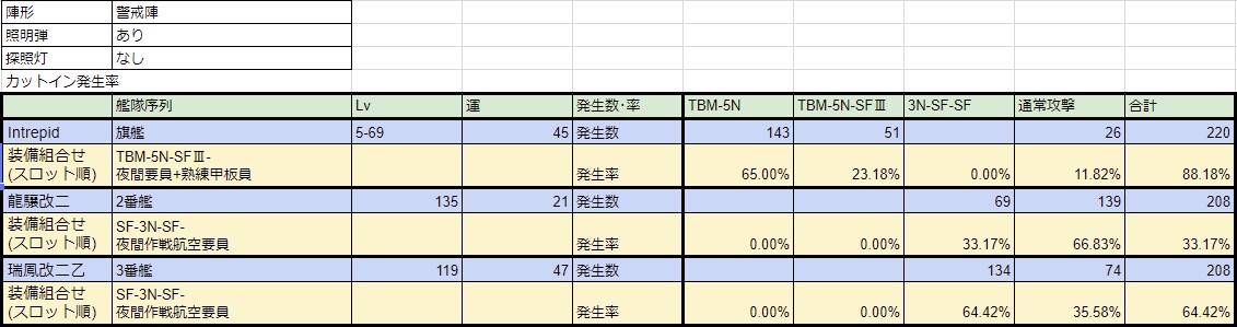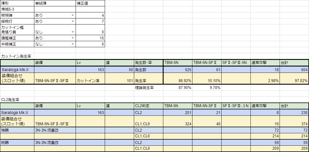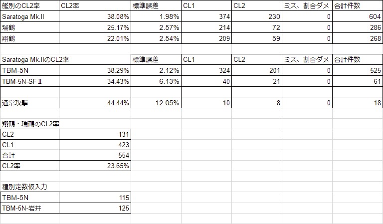 JavaScript をオフにした状態ではリッチテキストエディタを利用できません。ブラウザの設定で JavaScript を有効にするか個人設定で旧式のメディアウィキエディタに切り替えてください。 フォロー 0 いいね 夜襲検証 芋鍋 ※2018年9月16日にて更新停止 夜襲検証2017年9月12日のアップデートによって夜襲攻撃、夜襲CIが実装された https://twitter.com/KanColle_STAFF/status/907576774967533568 エディタを読み込んでいます ぱずる が編集 2018年9月17日 (月) 00:52 引用 もっと見る 履歴 完了 変更を保存 プレビュー キャンセル 0 いいね ぱずる 夜襲カットインの発動条件について 昼戦での制空状態が互角・劣勢・喪失の場合に夜襲カットインが発動するかどうかを調べた。(調査日9月16日) (1)互角の場合 隼鷹改二に夜間作戦航空要員・ソードフィッシュMk3・ソードフィッシュMk2・F6F-3Nを搭載して3-2に出撃(熟練はすべて≫、出撃時制空値47)。Cマスのエリヲ×2編成(制空値54)に対して航空互角、夜戦にて夜襲CI発動を確認した。 (https://twitter.com/Ki_puzzle/status/909041633009713152) (2)劣勢の場合 (1)と同様の条件で3-3に出撃。Cマスのエリヌ×3編成(制空値72)に対して航空劣勢、夜戦にて夜襲CI発動を確認した。 (https://twitter.com/Ki_puzzle/status/909049542112247808) (3)喪失の場合 (1)と同様の条件で3-5に出撃。Cマスのヲ改・フラヲ(艦載機白)・フラヲ編成(制空値214)に対して制空権喪失、夜戦にて夜襲CI発動を確認した。 (https://twitter.com/Ki_puzzle/status/909058172064636928) したがって昼戦の制空状態にかかわらず夜襲CIは発動すると考えられる。 エディタを読み込んでいます 2017年9月23日 (土) 11:21 引用 もっと見る 履歴 完了 変更を保存 プレビュー キャンセル 0 いいね ぱずる 夜襲カットインは開幕夜戦でも発動するか 開幕夜戦マスでも夜襲CIが発動するかどうかを調べました。(調査日9月23日) 隼鷹改二にTBM-3D・F6F-3N・夜間作戦航空要員・彩雲を搭載し5-3へ出撃。Cマスにおいて夜襲CI発動を確認した。 (https://twitter.com/Ki_puzzle/status/911553105409359873) また、Saratoga Mk2にTBM-3D・F6F-3N・零式艦戦53型(岩本隊)・零式艦戦21型(熟練)を搭載し4-5へ出撃。Eマスにおいて夜襲CI発動を確認した。 (https://twitter.com/Ki_puzzle/status/911534620088270848) したがって、現在実装されている通常海域・ExtraOperation海域における開幕夜戦マスでは夜襲CIは発動すると考えられる。 エディタを読み込んでいます 2017年9月23日 (土) 11:40 引用 もっと見る 履歴 完了 変更を保存 プレビュー キャンセル 0 いいね 芋鍋 各検証者の検証によって現段階(2017/9/23)で実装されている以下の艦載機が夜襲において影響があることがわかった F6F-3N,F6F-5N,TBM-3D,Swordfish系,零戦62型(爆戦/岩井隊) (この報告ではこれらを夜間飛行機と呼称する) (F6F-3N,F6F-5N=夜戦、TBM-3D=夜攻、Swordfish系=SF、零戦62型(爆戦/岩井隊)=岩井爆戦) また以下の基本攻撃力式及び夜襲CI補正値の仮説が建てられた 基本攻撃力=素火力+∑(夜間飛行機火力)※+∑(夜間飛行機雷装)※+∑(夜間飛行機搭載補正)+夜間触接補正 ※夜間飛行機の搭載機数が0になった場合火力、雷装加算は無効となる 夜間飛行機搭載補正=係数A*機数+係数B*(火力+雷装+爆装+対潜)*√(機数)+√(★) 最終攻撃力=[[cap(基本攻撃力*夜襲CI補正*損傷補正,300)]*CL2補正*熟練CL2補正] 夜戦・夜攻 係数A=3 係数B=0.45 SF・岩井爆戦 係数A=0 係数B=0.3 夜襲CI補正 夜戦/夜攻:1.2 夜戦/夜戦/夜攻:1.25 夜戦/夜戦/夜戦:1.18 夜戦/夜攻/SF:1.18 夜戦/夜戦/SF:1.18 夜戦/SF/SF:1.18 夜戦/SF/岩井爆戦:1.18 夜戦/夜戦/岩井爆戦:1.18 夜戦/夜攻/岩井爆戦:1.18 また夜襲CIの種類に関しても仮説も建てられた 夜戦→種類1 夜攻→種類2 その他(SF、岩井爆戦)→種類3 とし 種類1+種類2→CI種類A(1.2倍) 2*種類1+種類2→CI種類B(1.25倍) 3*種類1→CI種類C(1.18倍) 種類1+種類2+種類3→CI種類D(1.18倍) 2*種類1+種類3→CI種類E(1.18倍) 種類1+2*種類3→CI種類F(1.18倍) ソース群 https://docs.google.com/spreadsheets/d/1m5Pd0xDoTIi8sMV8yNeSl4TNhxqtVnzoccSGAFTzIBk/edit?usp=sharing https://docs.google.com/spreadsheets/d/1nfDnLzBszSEivDFTmy-TKlY2IVH2ICmVgd_310Yv91A/edit?usp=sharing https://docs.google.com/spreadsheets/d/1GiIIs4b-pIitUa2AgawWGEf17IiX6NKp_tuDFn3AtHQ/edit?usp=sharing https://docs.google.com/spreadsheets/d/1Aw3zlexVkEYvBsTiqeuG4eNRtkhYTx7blZCAgXc4xWs/edit?usp=sharing この報告は現在の検証結果のまとめとして報告させてもらいました 夜襲検証に参加した皆様お疲れ様でした 追記補足 17/10/29 熟練CL2補正に関しての補足 非夜間飛行機及び夜間飛行機(戦闘機以外)の熟練度を参照して補正値を決定する (要するに昼戦通常砲撃と同様) エディタを読み込んでいます 芋鍋 が編集 2017年10月29日 (日) 10:52 引用 もっと見る 履歴 完了 変更を保存 プレビュー キャンセル 0 いいね トロルキン 夜間戦闘機熟練度の夜襲攻撃力への影響 瑞鳳とF6F-3Nを用いて熟練度0とMAXでの与ダメージを比較したhttps://twitter.com/trollkin_ball/status/919068556775399425装備は上から夜間作戦航空要員/Swordfish(熟練MAX)/烈風(熟練MAX)/F6F-3N(熟練なし) 駆逐ロ級への夜襲CL1は57~60の与ダメージであり、同じ装備かつF6F-3N熟練度MAXと同じ範囲であることが観測された。よって夜襲CL1攻撃力
