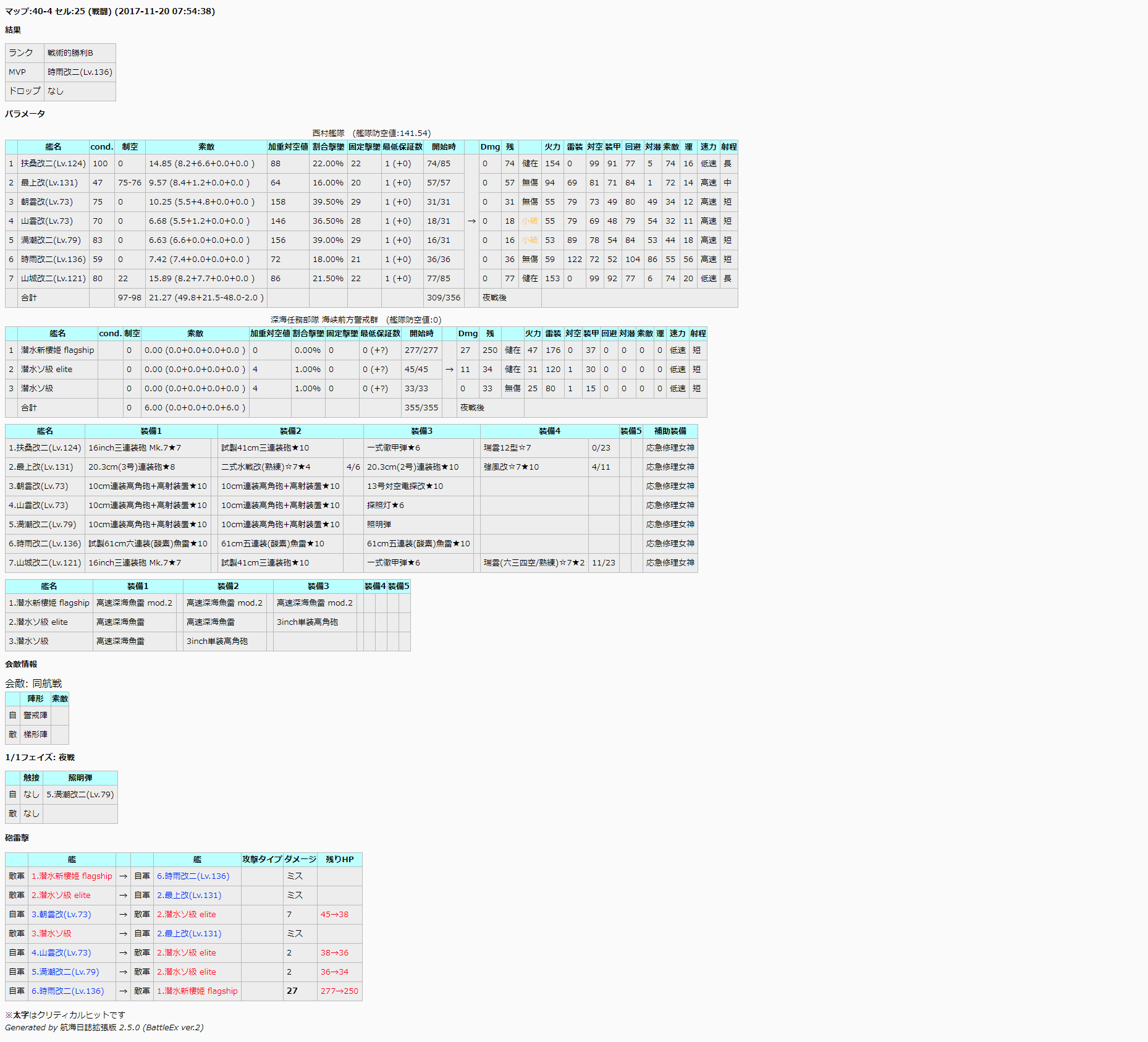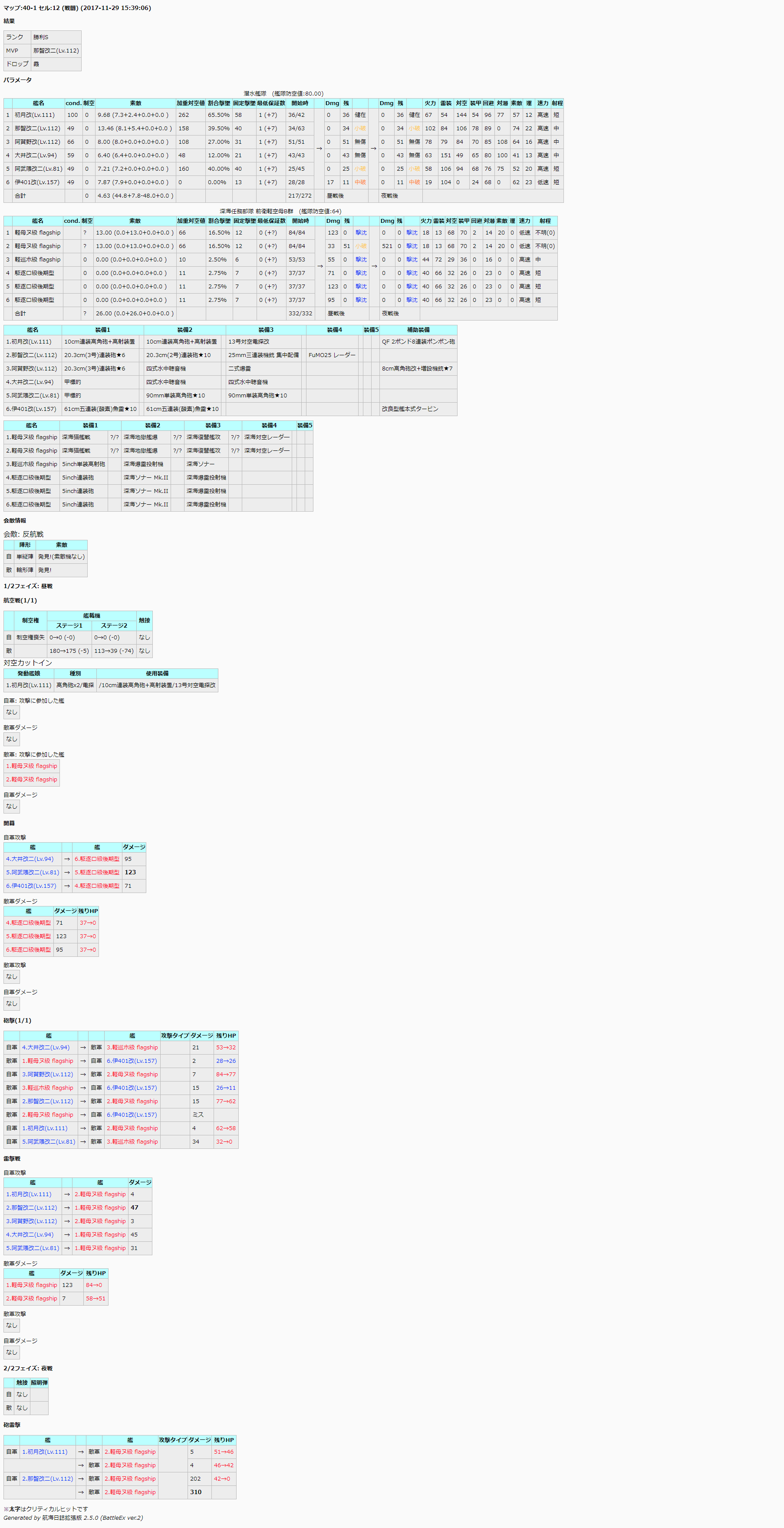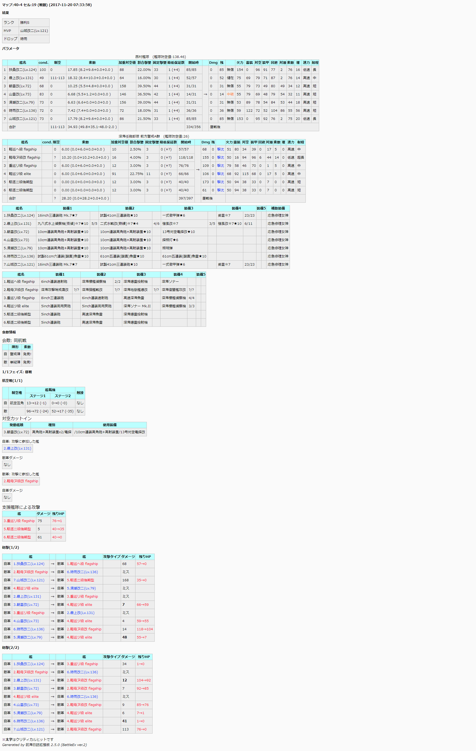 JavaScript をオフにした状態ではリッチテキストエディタを利用できません。ブラウザの設定で JavaScript を有効にするか個人設定で旧式のメディアウィキエディタに切り替えてください。 フォロー 0 いいね ギミック検証 FANDOMユーザー 125.54.150.31 ※2018年9月16日にて更新停止 イベント時のギミック検証用スレ それに関する予想や考察、結果を扱います。 Wikiaの仕様により、Wikiaのアカウントを持たずに投稿した場合、投稿内容とともに投稿者のIPアドレスが表示されます。IPアドレスが表示されたくない場合は、お手数ですが事前にWikiaのアカウントを作成し、ログインした状態で投稿をお願いいたします。 エディタを読み込んでいます ぱずる が編集 2018年9月17日 (月) 00:58 引用 もっと見る 履歴 完了 変更を保存 プレビュー キャンセル 0 いいね FANDOMユーザー 125.54.150.31 過去のデータ(╹‿ ╹. ) 2015秋E4甲潜水棲姫ギミック 水上連合ではキャップ後攻撃力+21・機動連合ではキャップ後攻撃力+28 https://docs.google.com/spreadsheets/d/18HC7ZEWjGtsgrActAmRbh-kHi36jg3kK0h8frVhD-XQ/edit?usp=sharing&pref=2&pli=1 ↑ギミック条件が複雑なのであっているか怪しい 2015秋E-5甲装甲ギミックの検証 https://docs.google.com/spreadsheets/d/1vvrDJLes20moKnvnIon6Gc8G9diAdnHO_-iipgvPRu8/edit ギミック発動時、削り・最終編成にかかわらず、 防御力:-22~-24 CL2補正後:+22~+24 最終攻撃力:+22~+24 ↑いずれもほぼ同じ位置、おそらく防御力から固定値減算? エディタを読み込んでいます 2016年2月13日 (土) 01:28 引用 もっと見る 履歴 完了 変更を保存 プレビュー キャンセル 0 いいね Umya 2016冬 E-1 潜水棲姫のダメージ検証 https://docs.google.com/spreadsheets/d/1O4a6Vi6aLtQrptwGupE_ewm5I-a0C6kXO8wveIklc94/edit#gid=818120013 E-1(現時点で甲のみ確認)の潜水棲姫は、 水母棲姫、補給艦の撃沈回数や、編制などにかかわりなく、2月11日20時付近を境として、 「防御力が22.1以上22.3未満減少(2016/02/13 22:43修正)」、具体的にはダメージが23程度の上昇を確認 (スプレの画像で言うb_1,b_2,b_7の位置) すなわち、潜水棲姫がギミックなしで弱体化されています 検証に協力してくださったノアの船さん、pixyさん、みゅんさん、CCさん、夢路さん、巴索さん、アッシュさん、お疲れ様でした!&有難うございました! エディタを読み込んでいます Umya が編集 2016年2月13日 (土) 13:45 引用 もっと見る 履歴 完了 変更を保存 プレビュー キャンセル 0 いいね Umya データ公開用シート: https://docs.google.com/spreadsheets/d/1O4a6Vi6aLtQrptwGupE_ewm5I-a0C6kXO8wveIklc94/edit#gid=818120013 上記データでは2月11日20時以降、E-1において潜水棲姫の防御力が一定値減少 ⇒前述の時刻以降でも少ないものの反例が出てきた ⇒時刻別にダメージ計算式中の補正値の変動を観測することを目的として、データを新たに集める 以下、潜水棲姫の最大耐久値別でデータ書き込むスプレのリンク 最大耐久値160 https://docs.google.com/spreadsheets/d/1dIQx8LTWyqm5HgNOqhlsLcj85S8LrHxnycAYQa1gLY0/edit?usp=sharing 最大耐久値130 https://docs.google.com/spreadsheets/d/1DlOaTzmu-q3bDjTn9XCgDa0EyZ9aWJCqyMoX2GIpeWo/edit?usp=sharing 最大耐久値110 https://docs.google.com/spreadsheets/d/1XqRY28Q1FWOtFGhBkVS-FkyJB_yPXb2WdVHtIzWSuLA/edit?usp=sharing 本件のブロマガ:http://ch.nicovideo.jp/umya/blomaga/ar970626#- エディタを読み込んでいます 2016年2月15日 (月) 06:30 引用 もっと見る 履歴 完了 変更を保存 プレビュー キャンセル 0 いいね FANDOMユーザー 126.94.234.137 現在はサイレント修正説は否定されております エディタを読み込んでいます 2016年2月16日 (火) 03:19 引用 もっと見る 履歴 完了 変更を保存 プレビュー キャンセル 0 いいね Biikame #5 への返信 ご報告ありがとうございます。本検証に反映いたしますので、根拠となるソースの提示をお願いいたします。 126.94.234.137 曰く:現在はサイレント修正説は否定されております エディタを読み込んでいます 2016年2月16日 (火) 04:56 引用 もっと見る 履歴 完了 変更を保存 プレビュー キャンセル 0 いいね Umya 報告用にブログを更新しましたので再掲します。 http://ch.nicovideo.jp/umya/blomaga/ar970626#- 現時点では、右ダメージ式中のa1~a10を1、b2~b10を0として、 b1の値を潜水棲姫の最大耐久値によって以下のように仮定しています。 最大耐久値160:b1=16(587件中反例1件) 最大耐久値130:b1=22.1(2607件中反例42件) 最大耐久値110:b1=22.1(159件中反例件0) 詳細やスプレリンク等はブログの方を参照してください。 エディタを読み込んでいます 2016年2月18日 (木) 08:57 引用 もっと見る 履歴 完了 変更を保存 プレビュー キャンセル 0 いいね FANDOMユーザー 180.147.106.213 修正なしでは説明のつかない理論値越えダメージが、どのくらいの確率で出るのか計算してみました(クリティカル補正の有無が判別可能なこと、割合ダメージにならない状況であること、弾薬補正なしであること前提)。以後の検証に役立てば幸いです。 ・修正なしとする場合のダメージ 耐久160装甲93:攻撃力-(65.1~120.3) 耐久130装甲73:攻撃力-(51.1~94.3) 耐久110装甲53:攻撃力-(37.1~68.3) このときのダメージの理論値を、[理論値A]とする。 ・修正ありとする場合のダメ