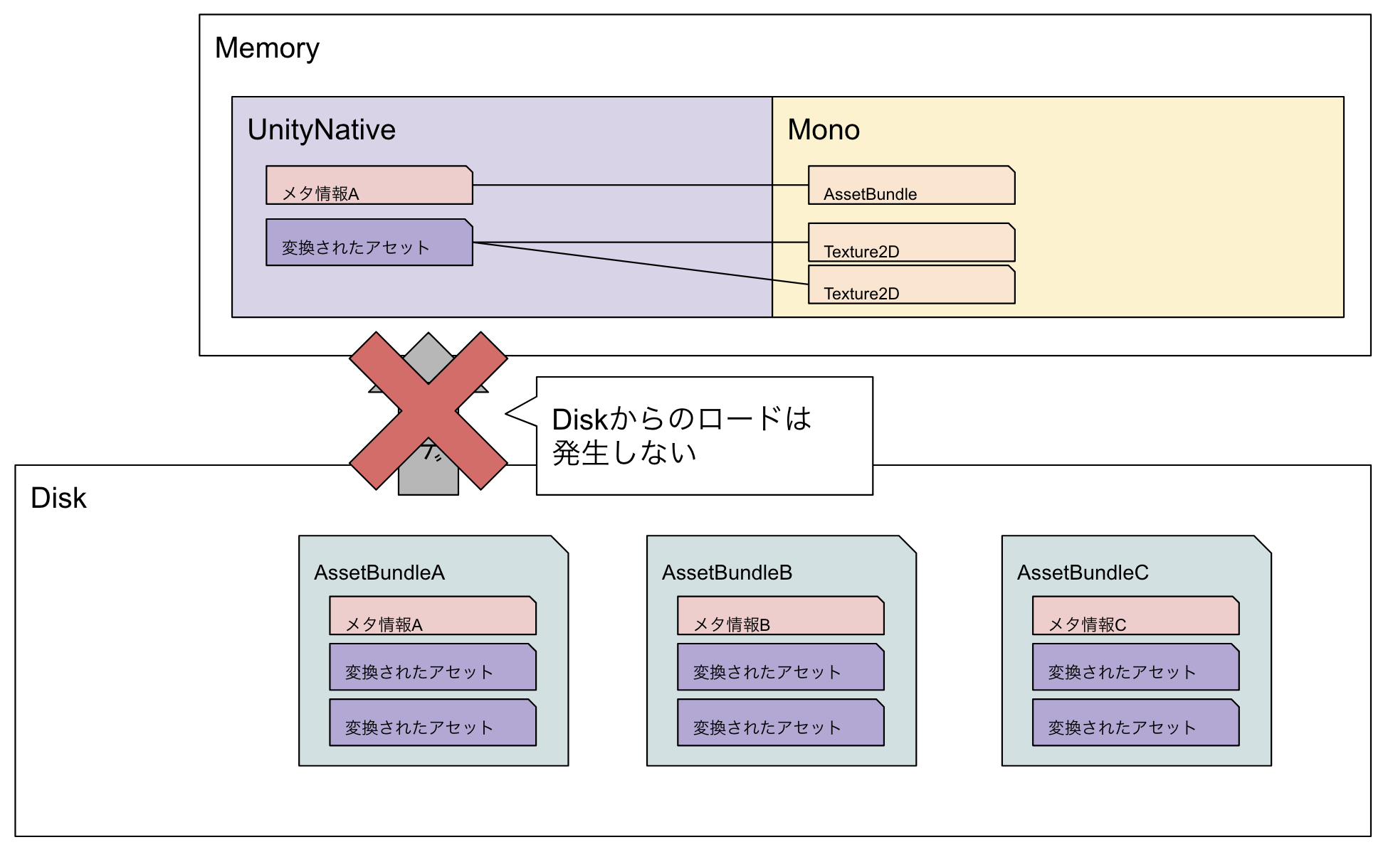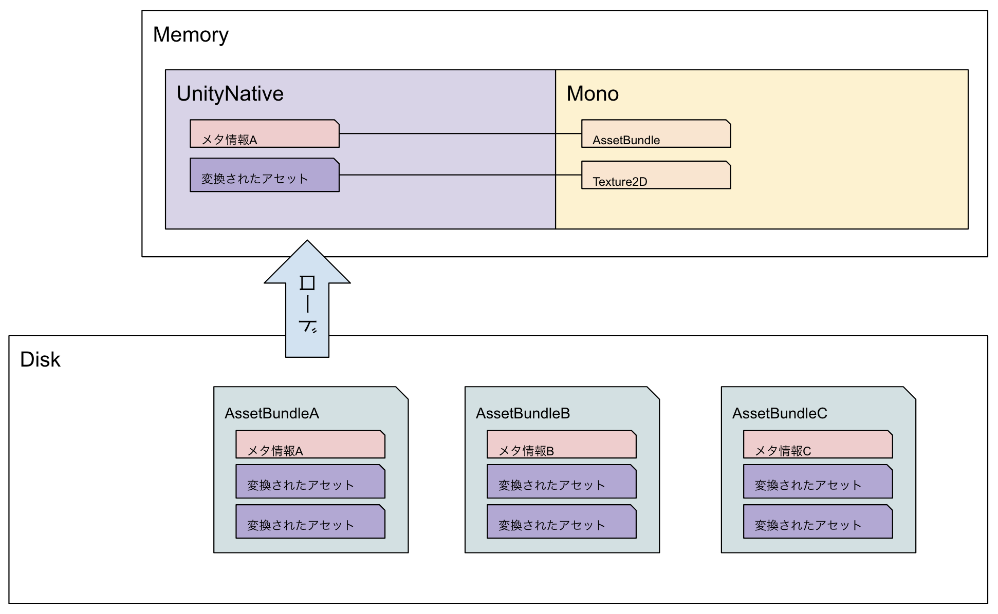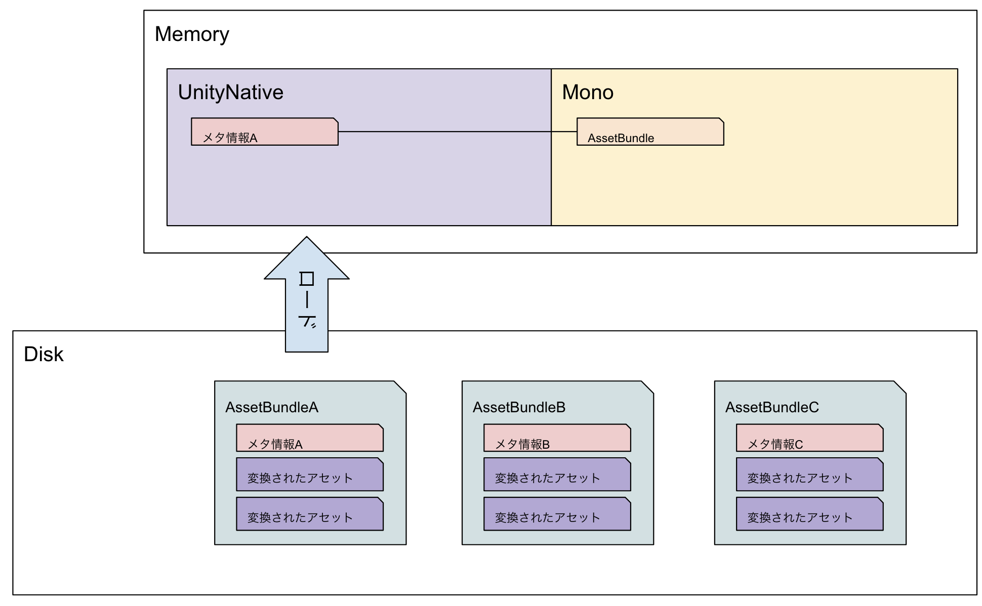 LoadFromFileの返り値となるMonoメモリ上にあるAssetBundleオブジェクトは、UnityNativeメモリ上にあるメタ情報への参照を持っているようなイメージ。