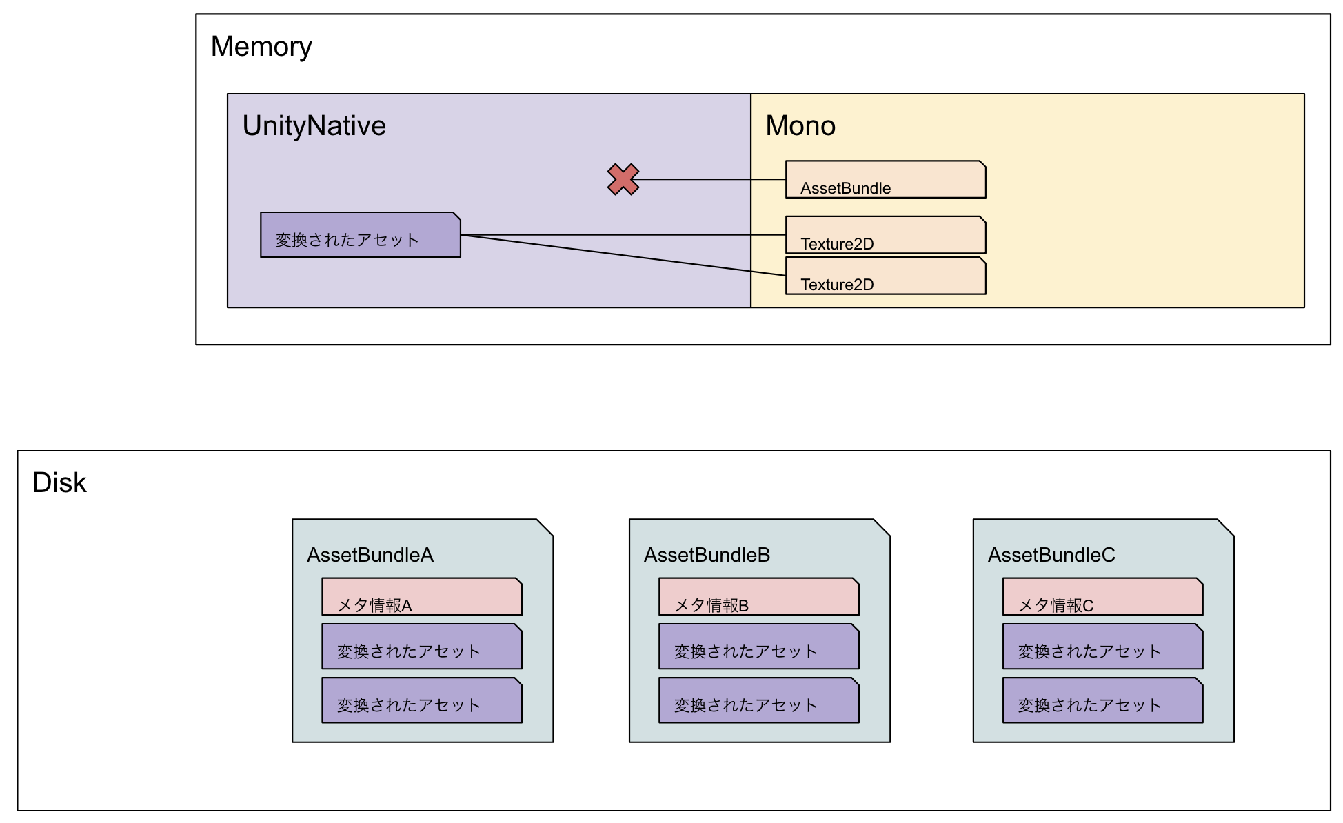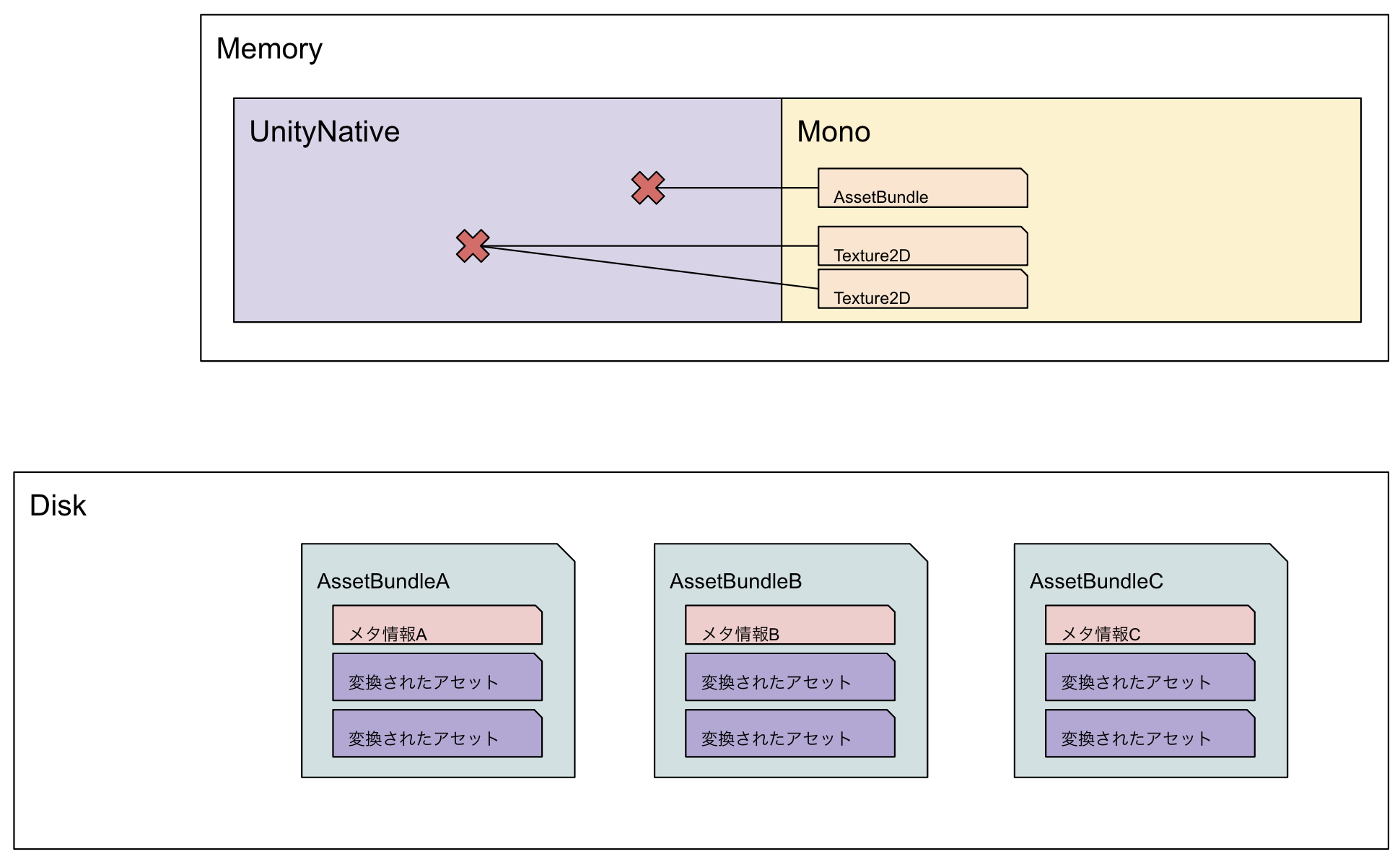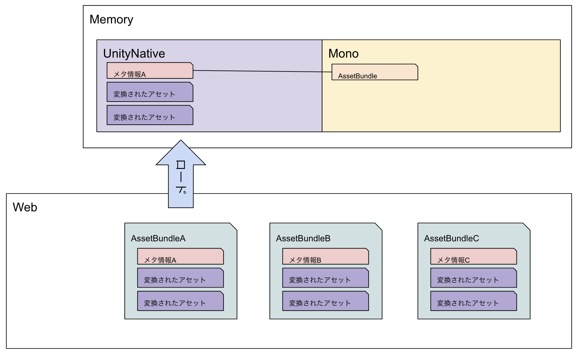 LoadFromFileの返り値となるMonoメモリ上にあるAssetBundleオブジェクトは、UnityNativeメモリ上にあるメタ情報への参照を持っているようなイメージ。