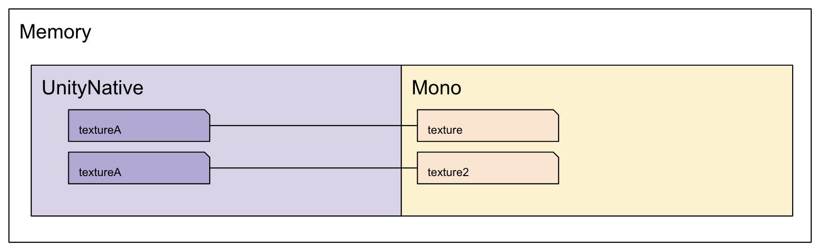 同じtextureAをロードしているが、一度メタ情報をUnloadした上で再び読み込んでいるため、同じテクスチャのデータがメモリ上に重複してロードされてしまい、メモリを無駄に消費してしまう。