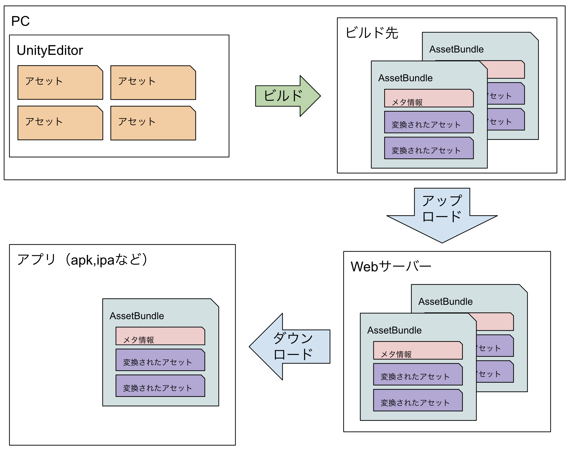 AssetBundleは、簡単に言えば「Resourcesではアプリのビルド時に行っている処理を事前に行っておく事により、実行時に外部からアセットがロードできるようになる」という仕組み。