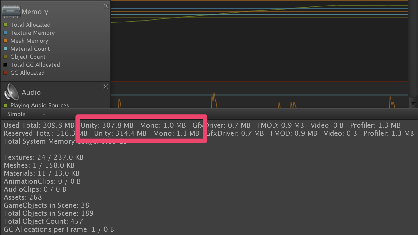 以下の解説で「UnityNativeメモリ」と「Monoメモリ」という単語が出てくる。簡単にまとめると、以下のような違いがある。