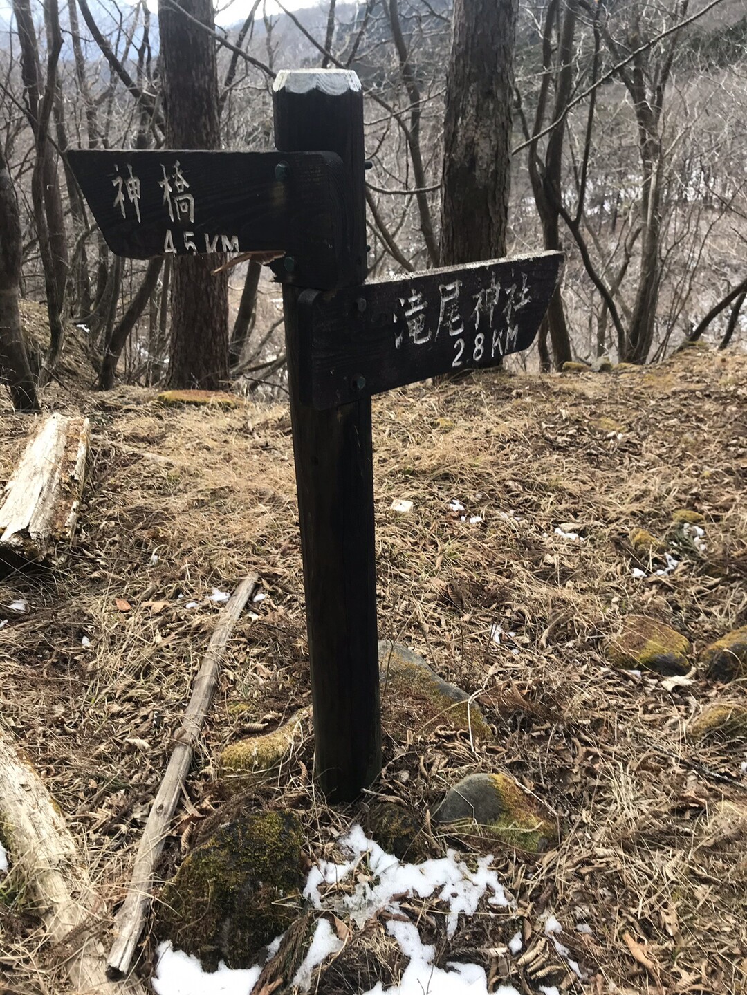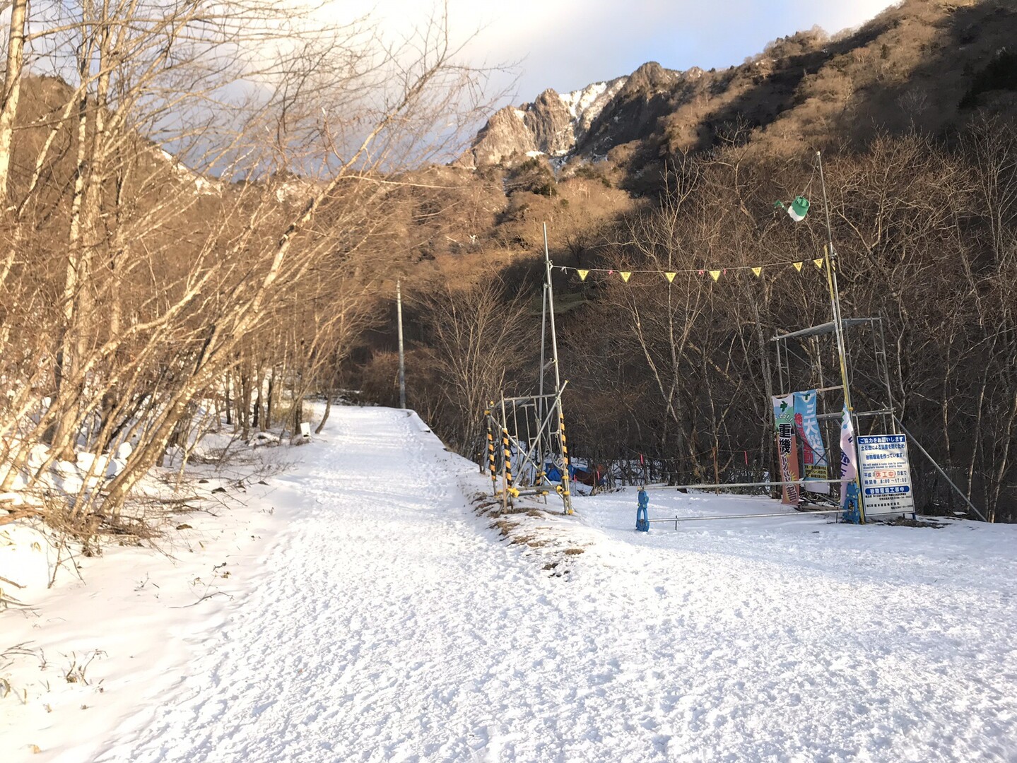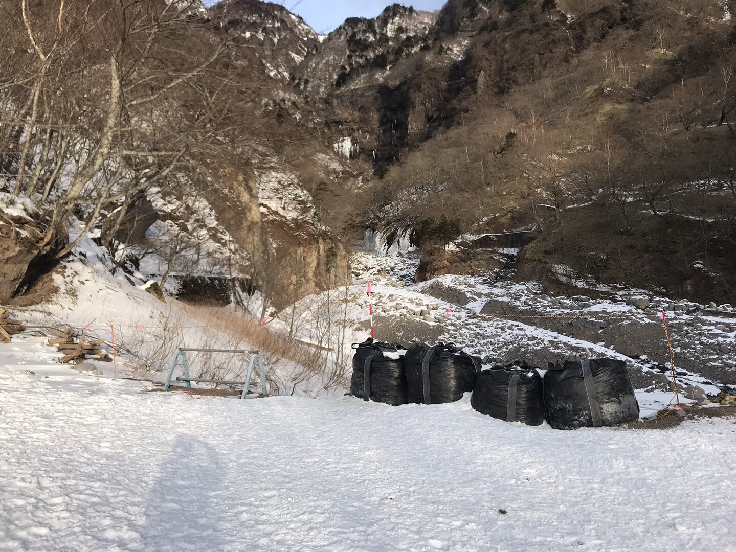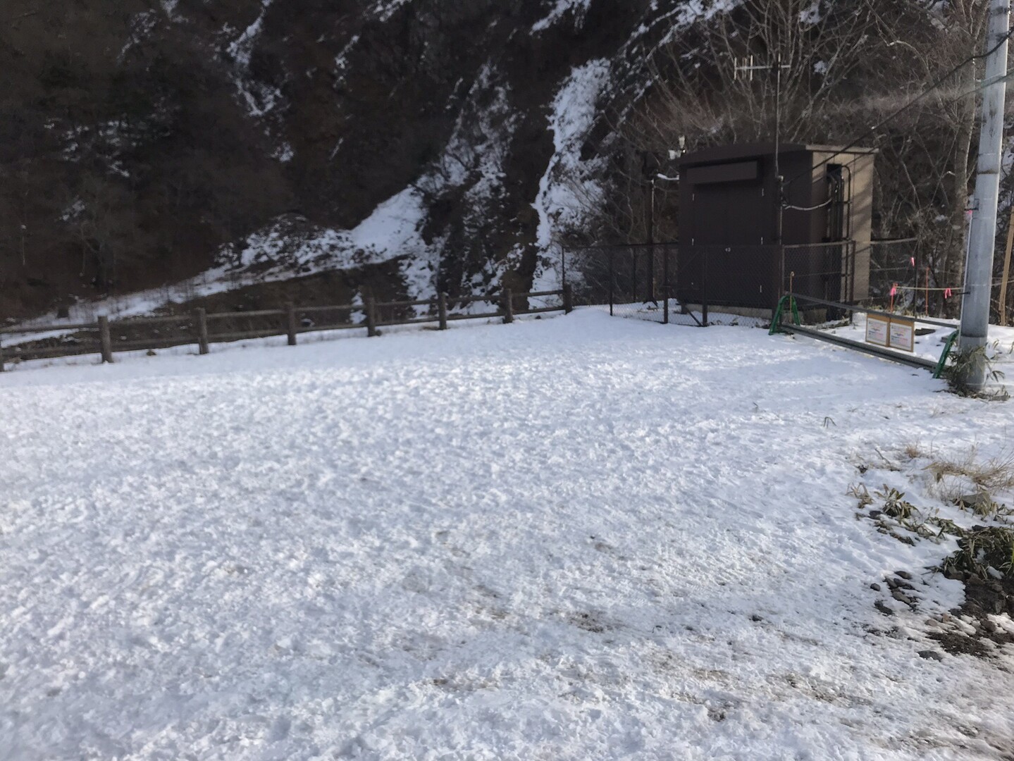 例年なら右側の林道から河原を歩きますが、今年は雪が少なく渡渉が難しそうだし、氷柱も育ってないので見応え無しと思われるので省略して左側の林道を行きます。 トレースも圧倒的に左側の道の方が多かったです。