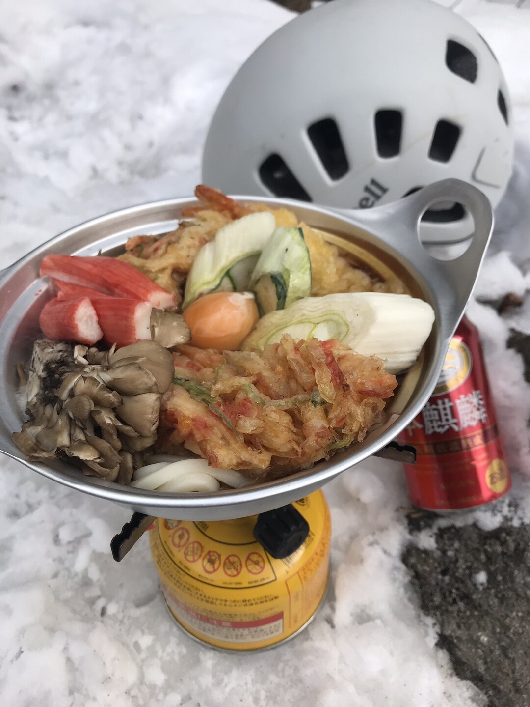 海老天かき揚げカニカマ舞茸下仁田ネギ入り月見うどん✨
