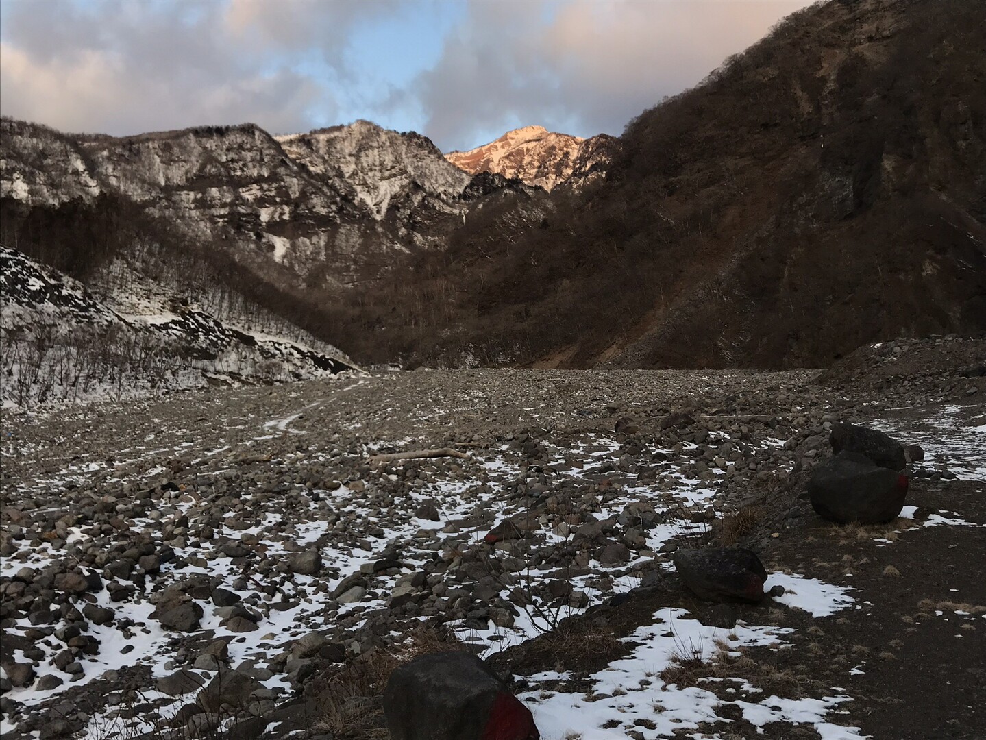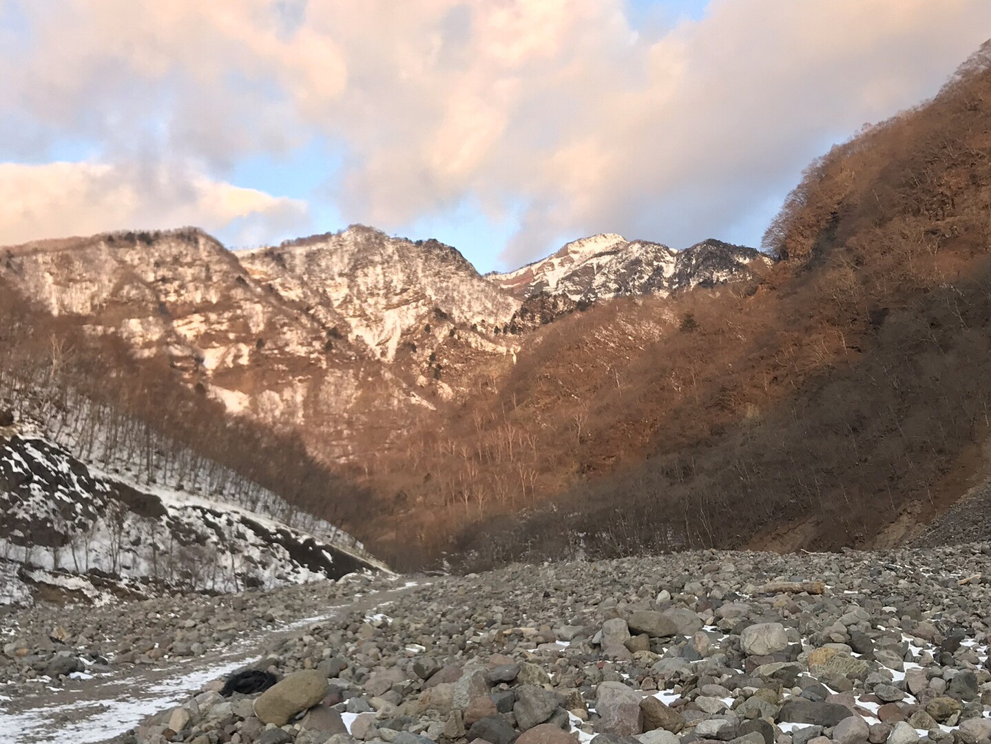 稲荷川の河原を歩きます。 女峰山モルゲンロート😍