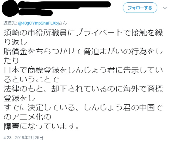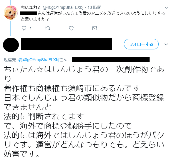 ・運営は先に商標を申請してしまったものの、今後しんじょう君の邪魔(アニメを放送できなくするなど)をする気はないんじゃないか?と希望的観測を抱いている