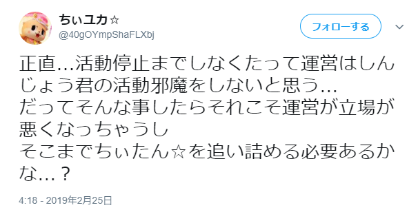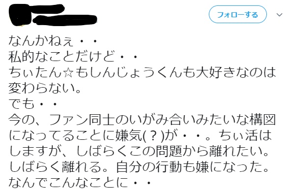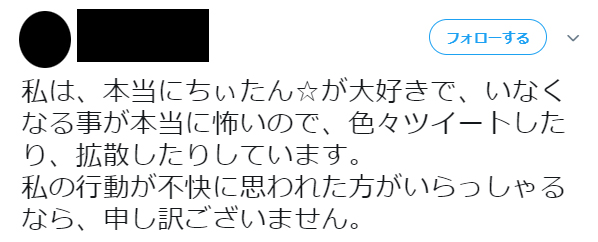 それとちぃたんのファンとしてフォローを返してくれたり軽く絡んでくれた人もごめんなさい。リムーブなりブロックなり好きにしてね。