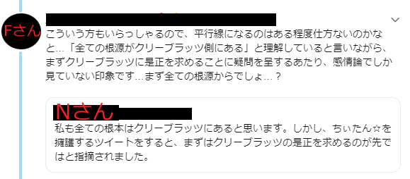 たしかNさんが署名ツイートを拡散したら署名活動の内容にクリーブラッツの悪質な内容も入れないとだめだというリプがきて、それに対応しきれず須崎市派の間でそれが拡散された。