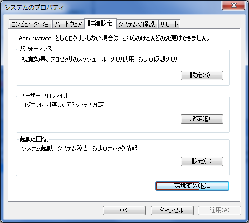 - 「環境変数(N)...」をクリックする。