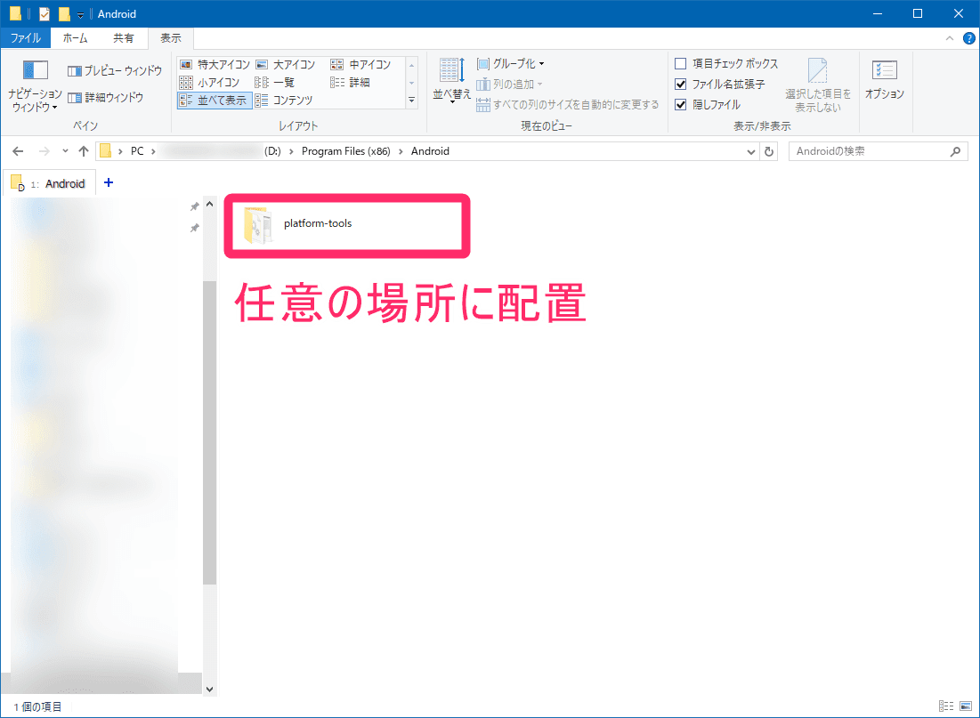 ※今回は、「D:\Program Files (x86)\Android」の下に配置しました。 - platform-toolsを含めた、配置した場所のパスをメモ帳などにコピーして覚えておく。