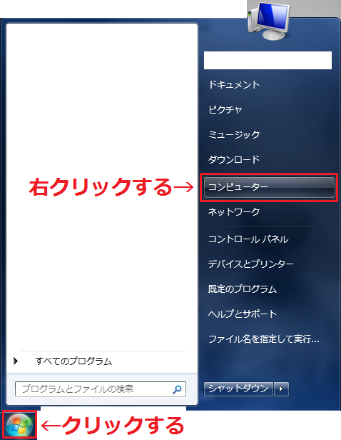 - デスクトップ左下の「スタート」ボタンをクリックし、「コンピュータ」の上にポインタを合わせて「右クリック」する。