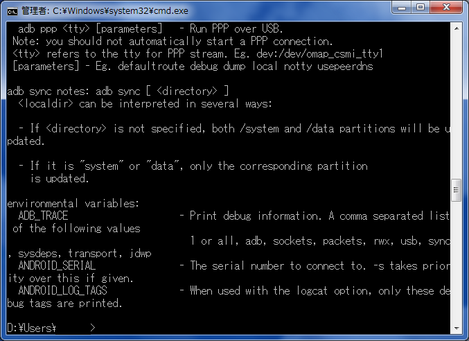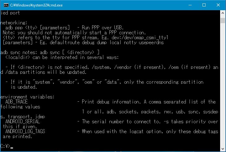 - 下の画像のような内容が表示され、adbコマンドが動作していることを確認する。