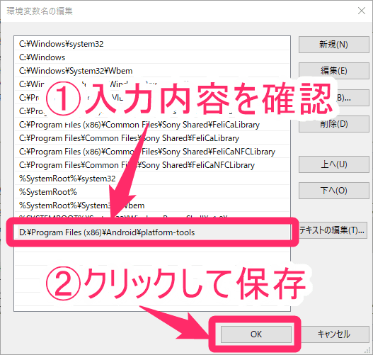 ※今回は、「D:\Program Files (x86)\Android\platform-tools」と入力 - パス名が正しく入力できていることを確認し、「OK」をクリックする。