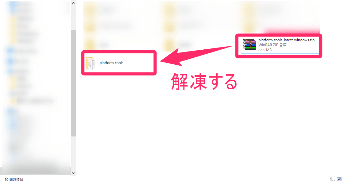 - 解凍して出てきた「platform-tools」フォルダを任意の場所に配置する。