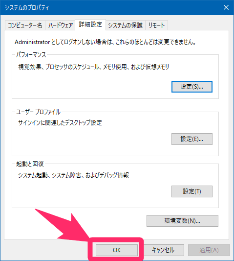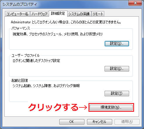 - 「システムのプロパティ」画面が表示されるので、「詳細設定」タブをクリックする。