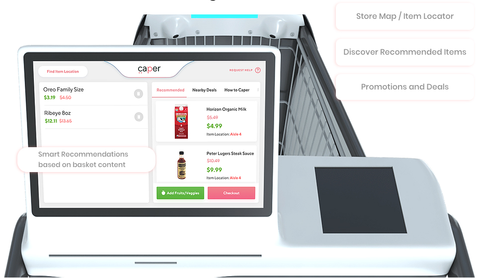 スーパーマーケットの店舗をチェックアウトフリーにするためのスマートショッピングカートを販売しているのがCaper(ケイパー)である。カートにセンサーやコンピュータービジョンカメラが搭載されており、カートに入れる商品を自動的に認識することが可能である。