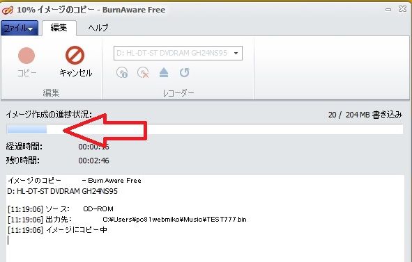 画像11 書き込みの作業画面が表示されるので、水色バーが右橋までいくと終了です