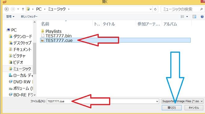 操作3 先ほど保存した「TEST777.cue」を選択して、下の「開く」をクリックします