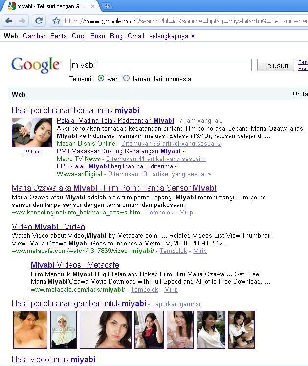 日本:「Miyabi」で検索してもAV女優の小澤マリアに関する画像は出てこない。一番目の画像はややセクシーだが、ミヤビとは何の関係もない。一方、インドネシア(Google.co.id)はと言えば。。。「Miyabi」の画像検索結果は以下のとおり。