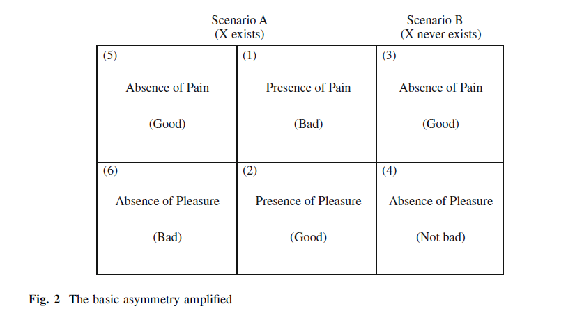 潜在的な子供の全体的な利害やウェルビーイングを考慮して、存在を与えることをやめることは奇妙だとは思わない。…しかし、存在を与える理由として、潜在的な子供の期待される喜びを引き合いに出すという構えもなく、存在を与えない理由として、予期される苦痛を引き合いに出すのは奇妙に思える