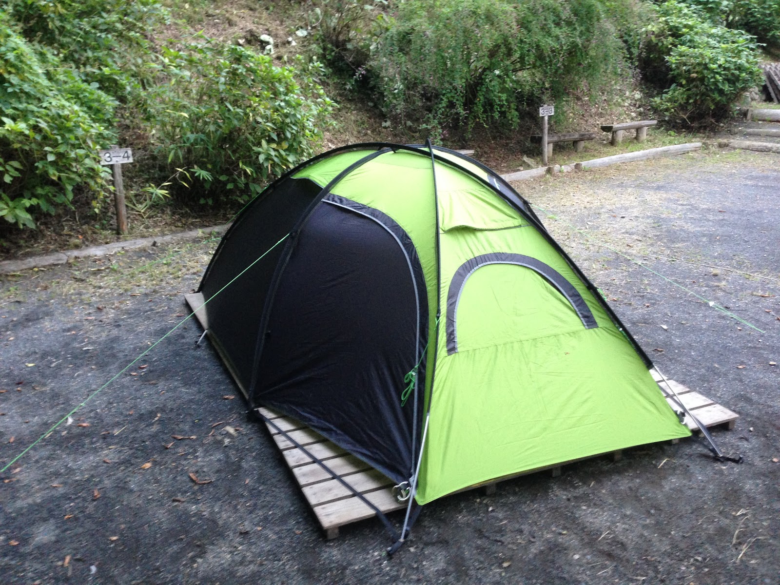 私が泊まったエリアは、キャンプサイトが段々畑のように並んでいます。区画が決まっていて、狭くは無いですがファミリーキャンパーが使うような大型テントを幾つか並べるスペースはないです。私の3人用のテントには十分な広さ。加えて今回は持ってきませんでしたがタープを広げる位のスペースはあります。このサイトの親切なところは、各区画にすのこと6人ぐらいは余裕で座れるベンチとテーブルが常設されていることです。これはほんとに便利でした。