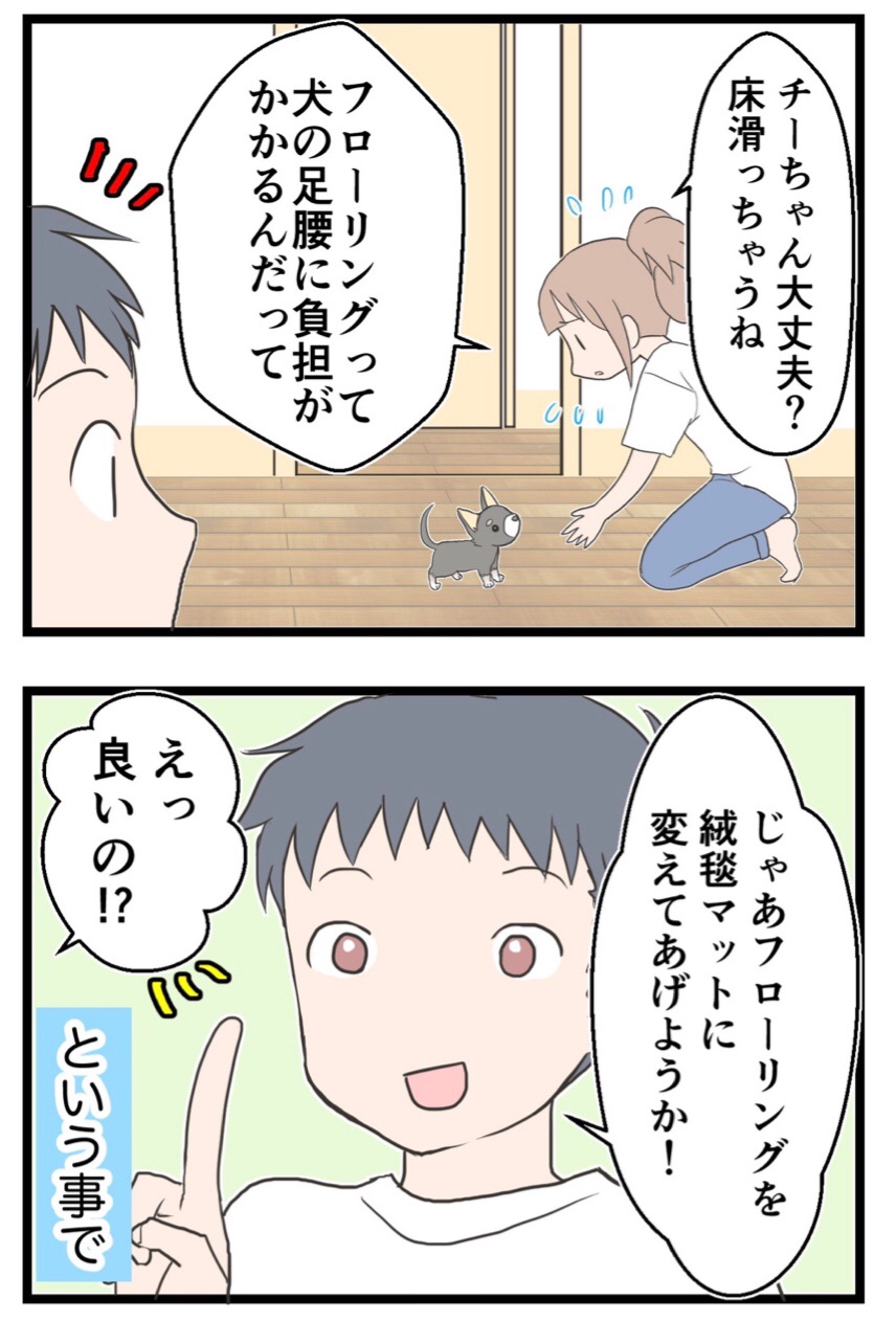 2019年06月12日 21・犬、飼い始めました!(フローリング) はじめましての方は→コチラ。第1話はこちら!前回の第20話はこちら!※絨毯マット⇨タイルカーペット、ジョイントマット夫も子どもたちも、チーを可愛がってくれています。(5歳の息子は、チーに対してちょっと手荒いですがf^_^;)本で、「フローリングは犬の足腰に負担がかかる」と読んだので、滑りにくくなるワックスとか、行動範囲に滑り止めを敷くとか、色々考えました。立ったままワイパー派 室内犬のためのすべり止め床用コーティング剤とオールワックスワイパーEXのセットリンレイサンコー はっ水 消臭廊下敷きマット カーペット マット おくだけ吸着 ロングマット 60×300cm ブラウン KH-69サンコー(Sanko)↑こういうの。夫がフローリングをリフォームしてくれたおかげで滑らないようになって、チーはとても快適そうです。良かったです(^^)続きます。▼その他のエピソードはこちら。初めてうつ病になった話の第1話はコチラ。産後にうつ再発編の第1話はコチラ。113話【番外編】もあります。(中傷被害に遭った話の後日談です。)【娘(第一子)出産話】の第1話はコチラ。看護学生時代の話↓【本当にあった病院での心霊現象】子どものケンカ編の1話目はこちら。↓書籍発売中です!息子の出産話を描き下ろしました!うちの子の場合! 子育てが10倍楽しくなる!出産&育児コミックエッセイ (メディアファクトリーのコミックエッセイ)カフカヤマモト2017-04-28※電子書籍もあります! 「ペットのこと」カテゴリの最新記事 20・犬、飼い始めました!(社会化期) 19・犬、飼い始めました!(2回目のワクチン③) 18・犬、飼い始めました!(2回目のワクチン②) 17・犬、飼い始めました!(2回目のワクチン①) 16・犬、飼い始めました!(トイトレ中) 15・犬、飼い始めました!(ケージを拡張した結果) 14・犬、飼い始めました!(ケージを広くする) 13・犬、飼い始めました!(トイレ上で遊んじゃう) 12・犬、飼い始めました!(メスのトイレ) 11.犬、飼い始めました!(ハウス気に入ってくれるかな?) タグ :チワワブラックタンホワイト犬のしつけロングコートチワワ犬との生活犬動物病院パピーパピーパーティ初めてのペット < 前の記事