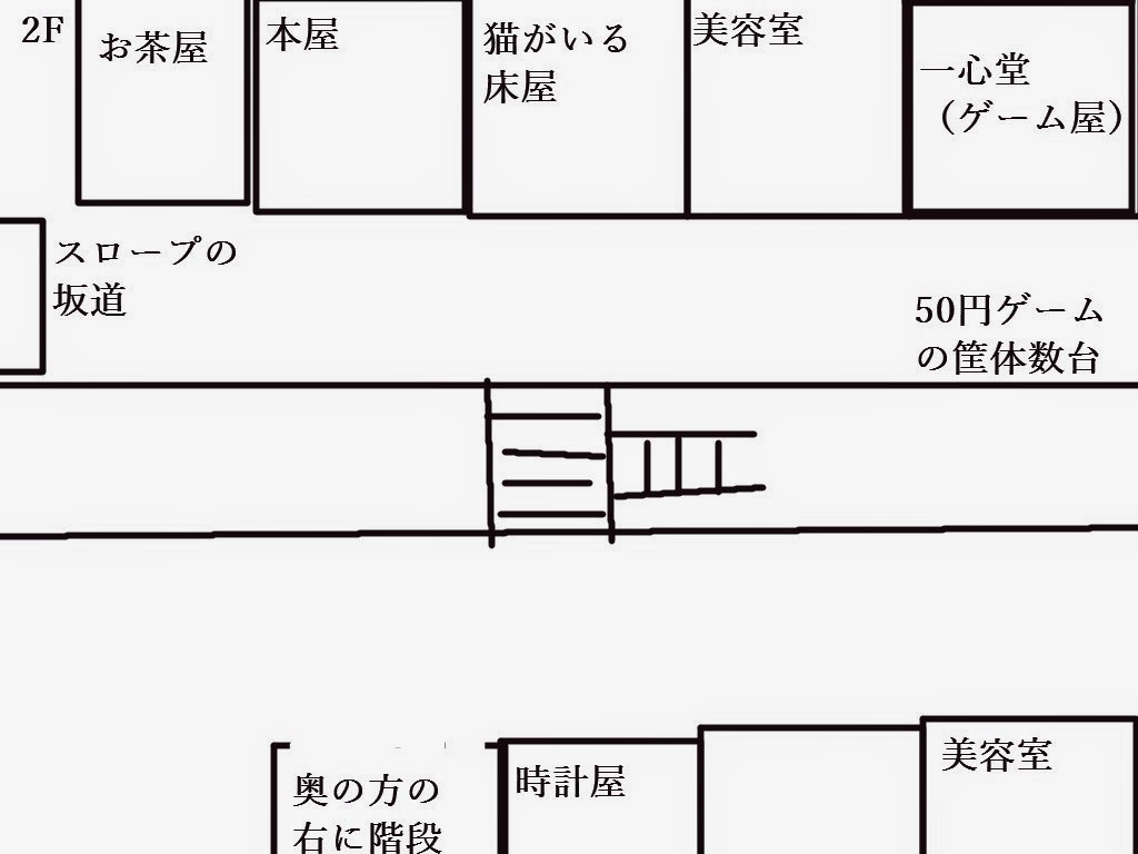 本屋は当時の行動範囲で唯一の本屋でしたのでよく通っていました。色々よくしてくれたおじさんがいて、片腕が少し不自由な方でした。この本屋に行くといつも声をかけてくれて商店街の福引の券も多めにくれたこともあります。そのおかげか小学校6年生の時にアメリカ旅行が当たったこともあり一緒に喜んでくれていました。本屋の内装は、結構高い天井まで本が詰まっており、店の真ん中にも本棚が配置されていて入り口からちょうど正面がおじさんが座ってるレジでした。おじさんもいつもいるというわけではなく日曜日は別の人で店長?が居ました。