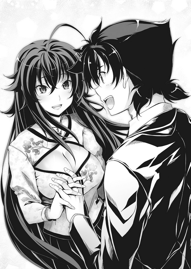 Issei reappeared in True Volume 1, where he was currently doing some paperwork and was informed by Ravel about Sasaki’s request and Xenovia came to inform that Morisawa has called for him. Rossweisse came and told Issei that she finished delivering the newly designed brochure and Asia asked him that she would like to receive payment and as the luggage was about to trip, Issei and his other peerage members went to help Asia. Issei attended the engagement press conference that was held at the Gremory territory and watched as Rias announced her engagement to Issei to the public and he gave out his speech to the people. After the engagement press conference, Issei was given tea by Ravel and Xenovia came to show Issei and Rias about the Underworld’s social media are trending about their engagement. Issei watched as Xenovia and Asia express their interest of wanting to have their own engagement press conference but became frightened about it and Akeno felt disappointed about not doing an engagement press conference and Koneko believed that not doing the conference doesn’t change that’s she’s Issei’s bride. Irina and Rossweisse revealed to Issei that they want to do it and will probably tell the higher-ups of Heaven and Norse, Issei became nervous after this reveal and he will need to get used to this. The next day in Kuou Academy, Issei was thinking about breasts and had less time talking with the girls because of his hard schedule from his work as Oppai Dragon and his participation in the rating game world tournament and he misses his days with the Church Trio as well misses touching Rias’s breasts. Issei became interrupted by Matsuda and Motohama who became angry with Issei after his talk about breast and continued to get closer to Asia, Xenovia, and Irina with Asia having feelings for him. Kiryuu came and asked the perverted trio if they planned to do a next peeking plan and another student named Hase came to see Matsuda and asked him if they can do something elsewhere and he agrees and left with her. Issei asked Kiryuu if Matsuda and Hase are in a relationship, which she reveals that Matsuda saved Hase when she was being hit, much to Issei’s surprise and Motohama’s despair. After school, Issei went to Morisawa‘s apartment to do his devil work after being summoned by him and discuss with him about introducing Morisawa a new girl. Issei recalls that Morisawa summoned Koneko, Xenovia, and Rossweisse to be his girlfriend but they revealed that they are already in a relationship with Issei which causes some despair to Morisawa.