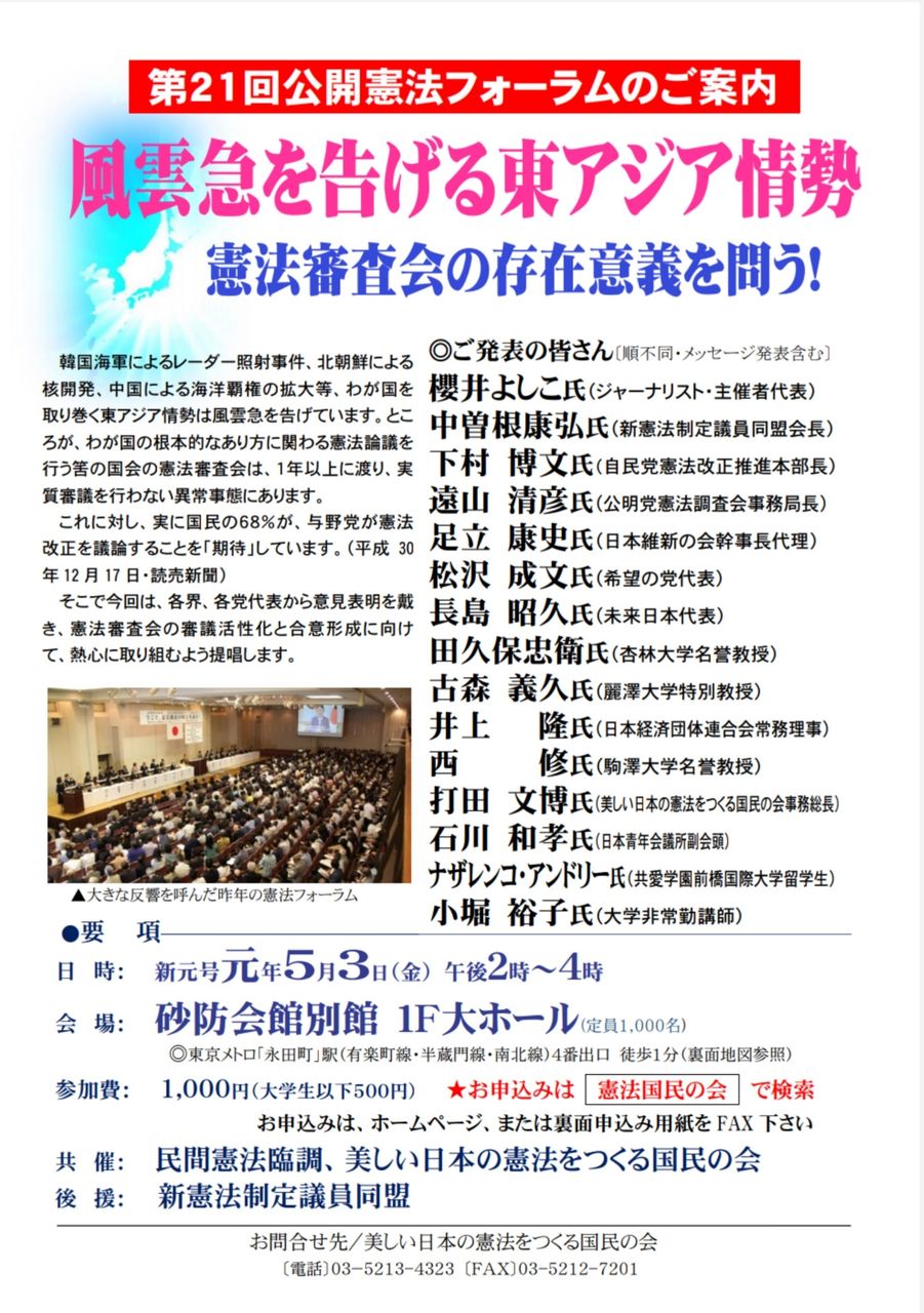 また、「美しい日本の憲法をつくる会」が「民間憲法臨調」(日本会議の別動隊。代表:櫻井よしこ)との共催で開いた今年の「公開憲法フォーラム」ですが、そこでも"憲法審査会の存在意義を問う!"というテーマが掲げられていました