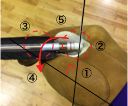 ⑤親指を中心に弦を捻る。(人差し指で矢を巻き込む様にする。箆(の)じないさせないこと)