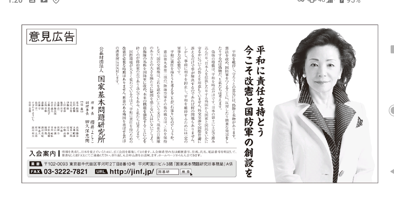 ・櫻井よしこ、田久保忠衛(日本会議会長)、高池勝彦(新しい歴史教科書をつくる会会長)がガッツリ手を繋ぐ国家基本問題研究所の評議員。改憲意見広告にも名前が載っている