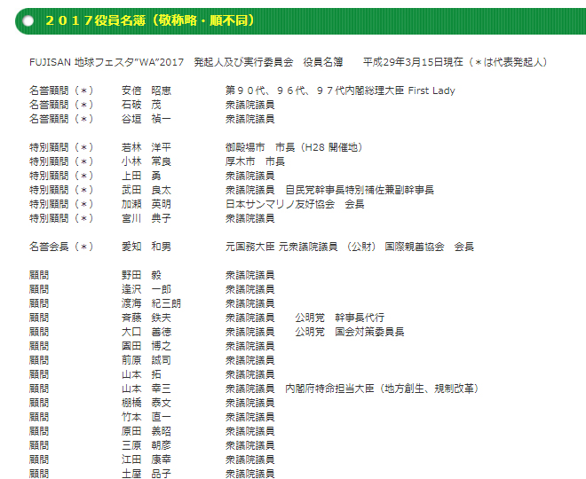 後述するように、「FUJISAN地球フェスタWA」に安倍昭恵氏や大量の国会議員の名が顧問などとして並び、中央官庁や地方自治体の後援が一気に増えたのは、この2015年からです。