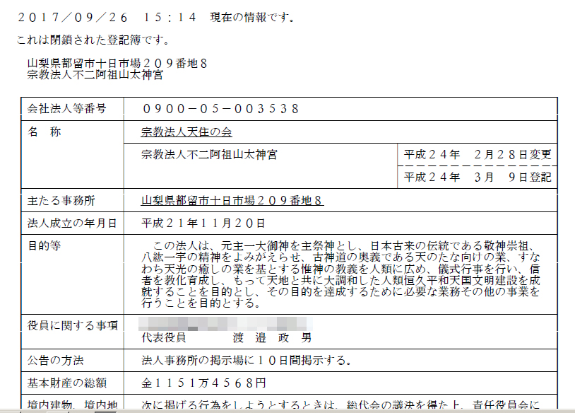 不二阿祖山太神宮の代表者である渡邉政男氏は大宮司を名乗り、伝統的な神道のようにも思える装いですが、近世に入ってから作られたと考えられる偽書を根拠とした神社である時点で、新興宗教(新宗教)であることは明らかです。しかも本紙が不二阿祖山太神宮の登記情報を確認したところ、法人設立は平成21年(2009年)。やや日刊カルト新聞社と同じ年の設立で、その歴史はたった8年しかありません。