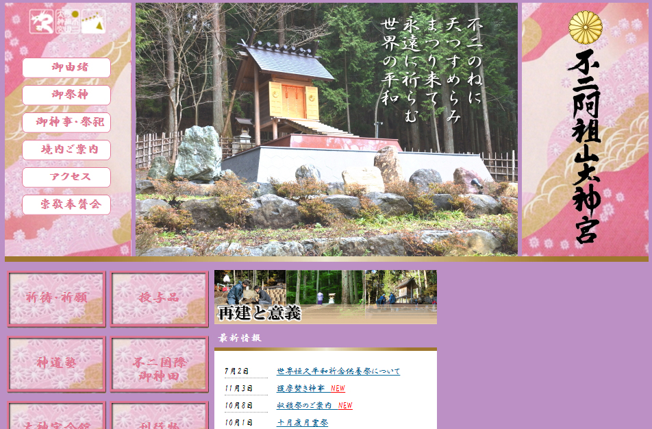 「渡邉政男・大宮司は、東京の生まれですが富士山の裾野に養子に来て、その後40年間、宮下文書の研究をされてきました。そのことから、不二阿祖山太神宮の再建に着手されたのです。はじめは任意団体“地球と共に生きる会”として数人のメンバーでスタートし、2002年にNPO法人格を取りました。この頃から不二阿祖山太神宮の再建は始めていましたが、神様事を手がけるには宗教法人が必要だということになり、2009年に宗教法人になりました。山梨県は、かつてオウム真理教があった地でもあるので、宗教法人を取得するのにかなり時間がかかりました」(担当者)