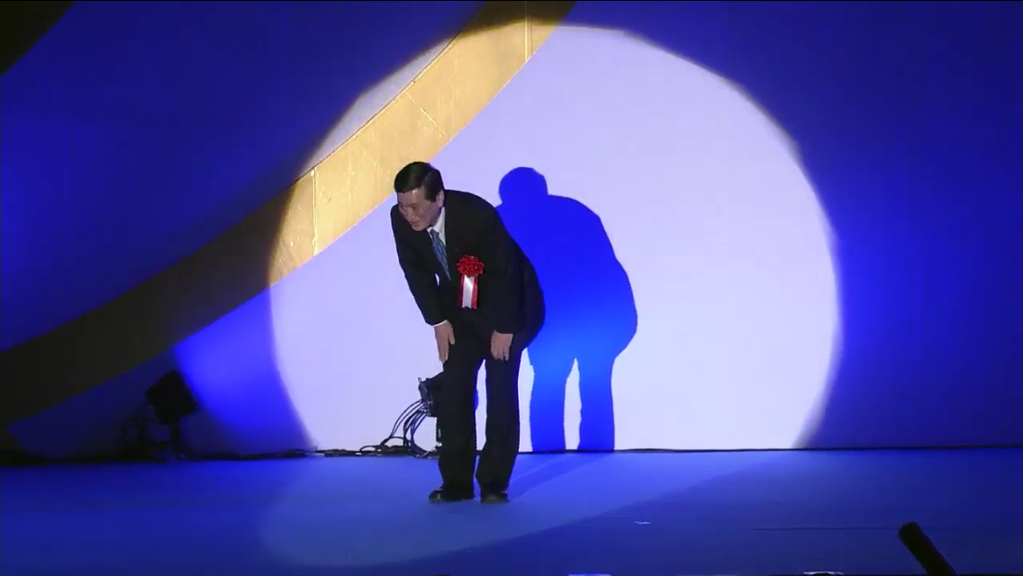 | 登壇する柳本卓治議員(上) 教団幹部や信者に御辞儀する柳本卓治議員(下) (以上、画像はPeaceTVより) |