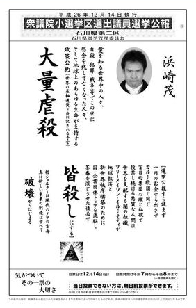 すべての候補予定者がカルト宗教がらみという“究極の3つ巴”に陥りかけていた石川選挙区。ここに「大量虐殺」の浜崎氏が加わる見通しが出てきたことで、さらに混沌としてきました。今回の参院選で浜崎氏がどのような公約を掲げるのか、注目されます。