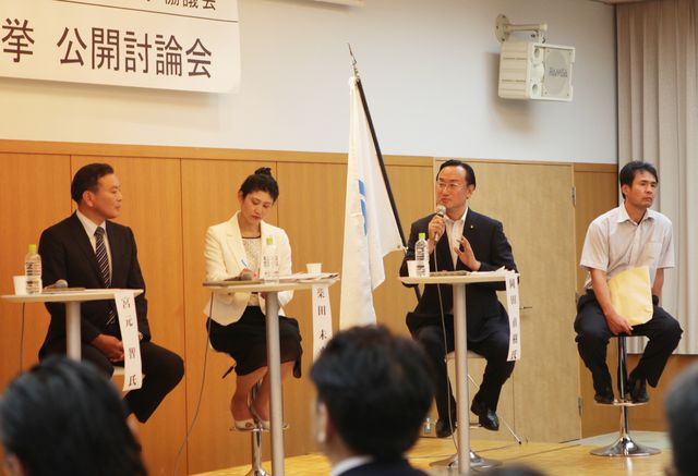 討論会では、現職の自民党・岡田直樹氏、無所属・柴田未来氏(民進・共産・社民・生活推薦)、幸福実現党・宮元智氏が登壇。しかし当日になって主催者から第4の候補予定者として、小松市でうどん店を経営する浜崎茂氏の名も紹介されました。