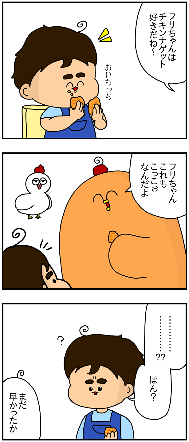 「こっこぉ=おいちっちなチキンナゲット」ってちゃんと理解したらショック受けるかなぁ。