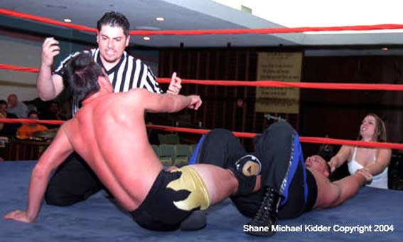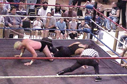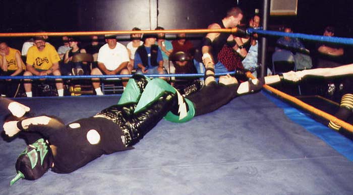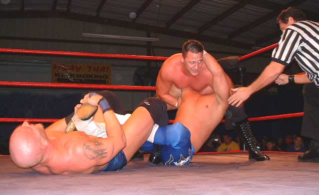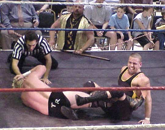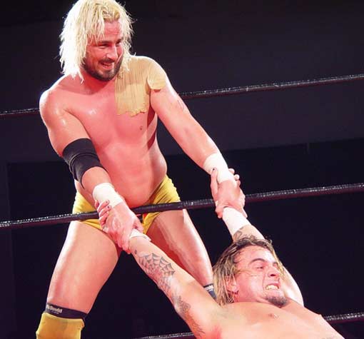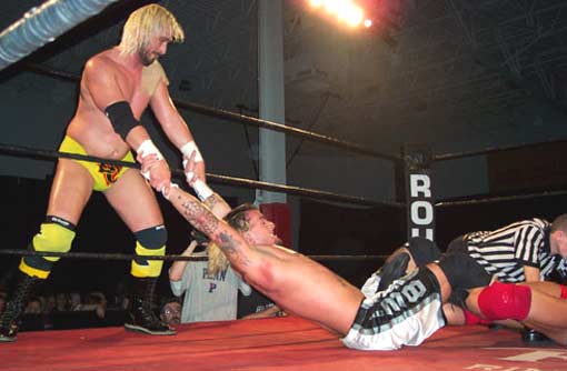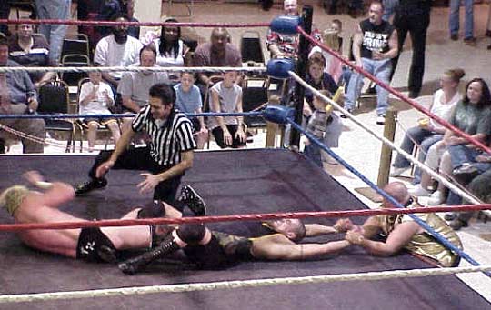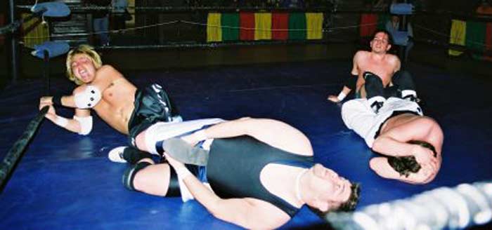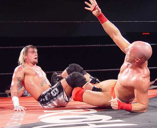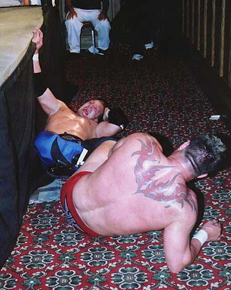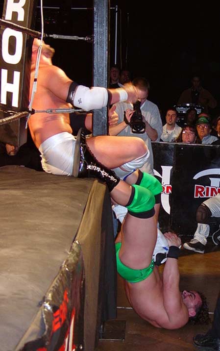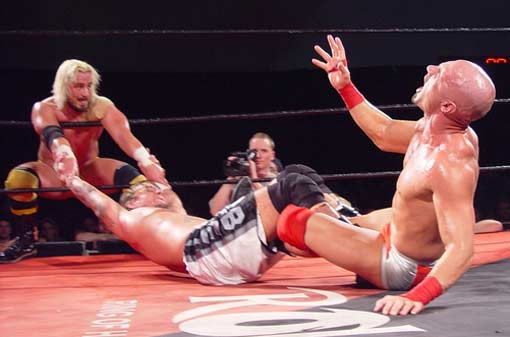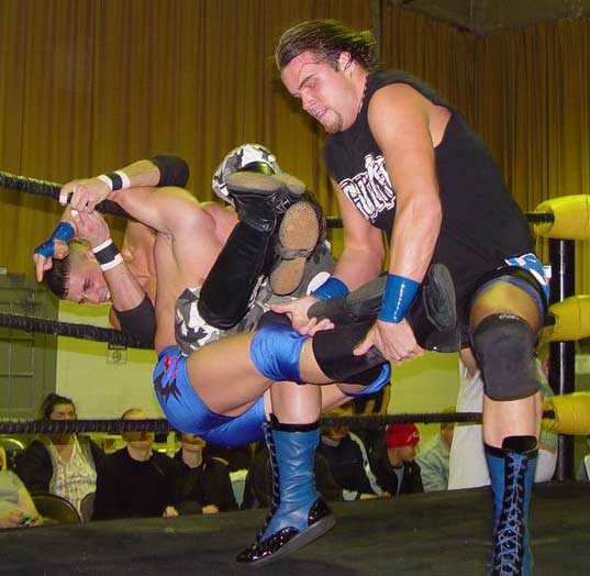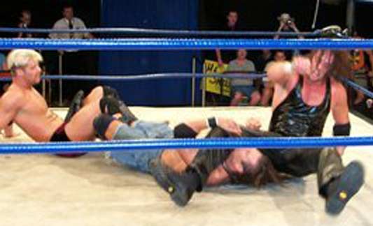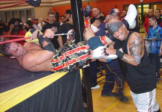 | Hey!! Punk has joined hands with his dirty Tag Team partner, Steve Corino. Now they work together, pulling and straining to torture poor Daniel's knee. |