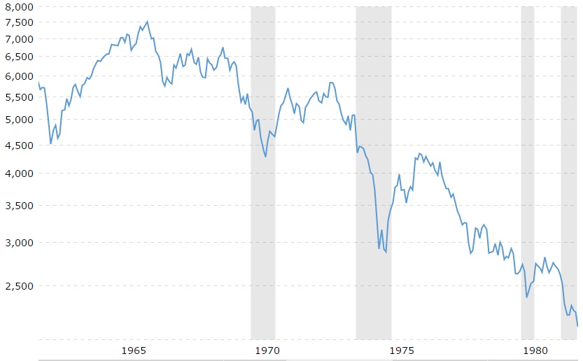 インフレ調整後では、1962年1月のダウ平均は5,665.50ドルですが、1982年2月は2,243.08ドルまで下落しています。
