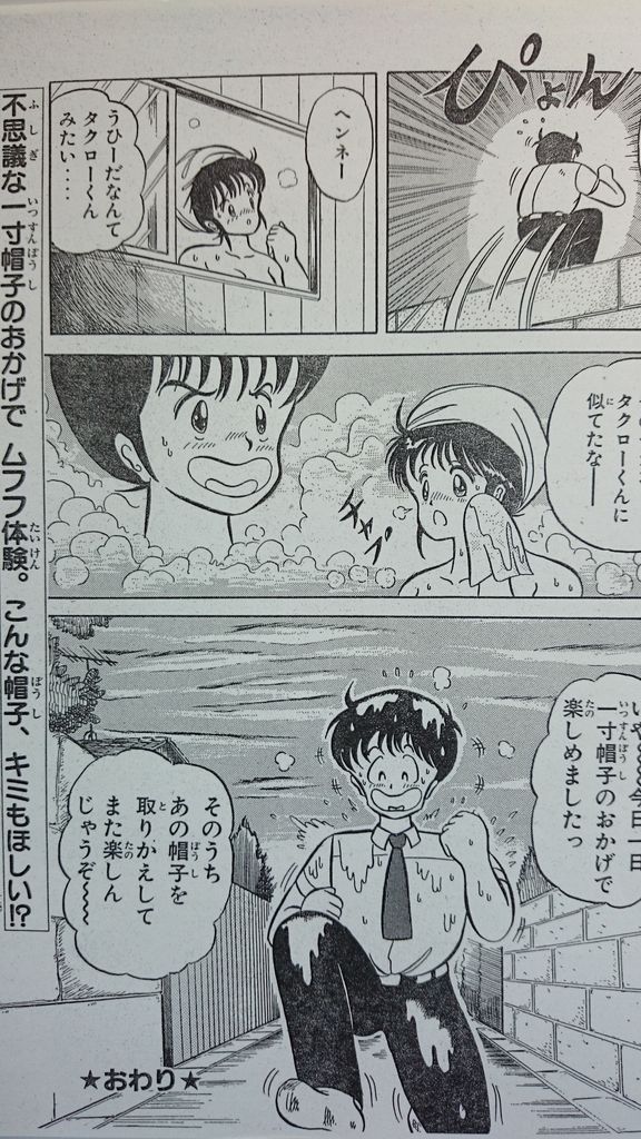 この作品は週刊少年マガジン1986年41号・42号に掲載された前・後編の読切り漫画でストーリーは主人公のちょっとエッチな中2男子のタクロー君が自宅で偶然「先祖代々伝わる被るだけで小人になれる一寸帽子」を手に入れてクラスメートの高橋つかさちゃんに学校やお風呂で色々とムフフなイタズラをしちゃうという内容です。