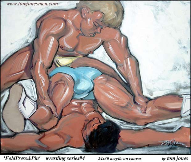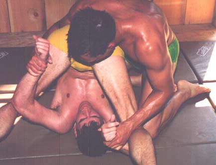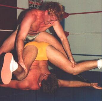 | There are several ways to split your opponent's legs while pinning him. This stud smiles as he applies a crotch splitting Fold Up Pin on the dude in the gold speedo. |