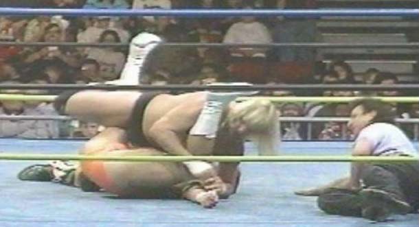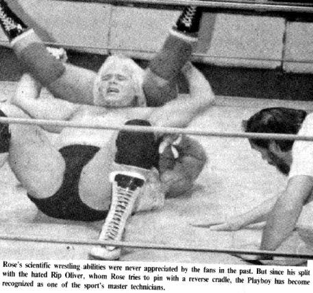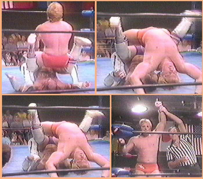 | Buddy Rose uses a "Reverse Cradle" to split his victim's legs, and pin him with his head pressed into the poor dude's crotch. |