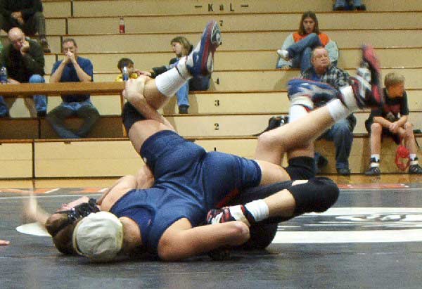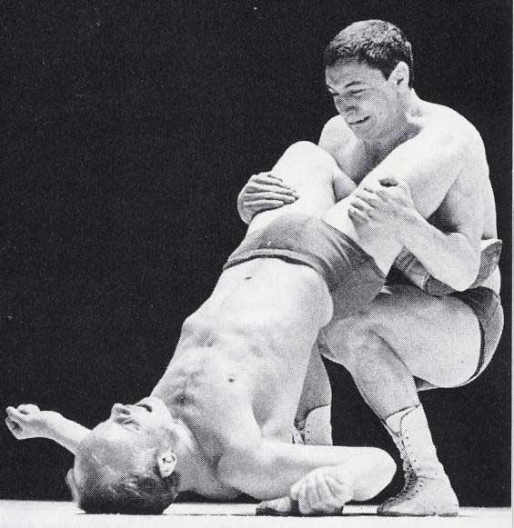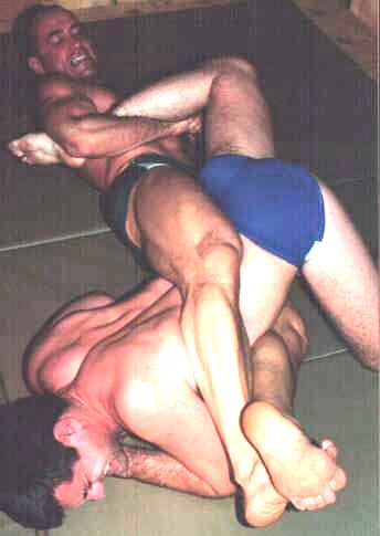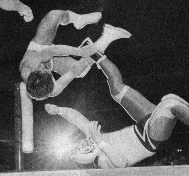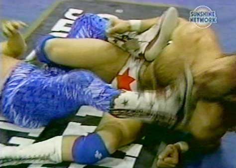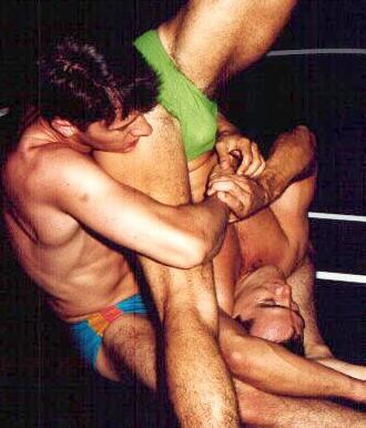 | The hi-flying stud in all white gear grabs the masked man's ankle and throws himself across the ring, snapping the victim's crotch wide open. |