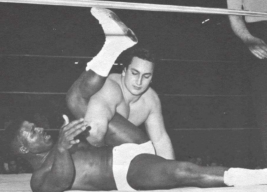 | The white wrestler simply reaches in and pulls back the black guy's leg, separating his thighs so he can check out those bulging white trunks. |
