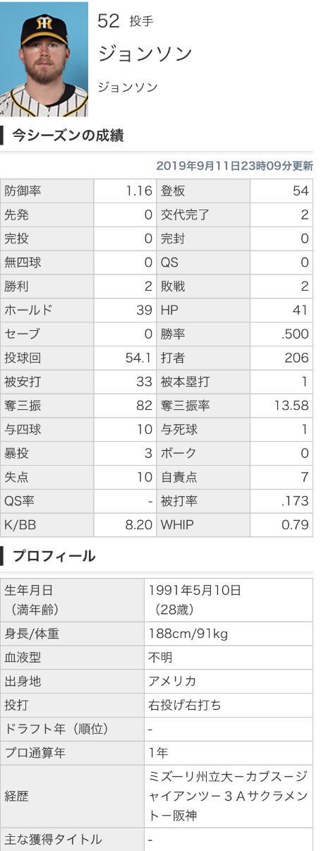 54登板 ジョンソン 1.16