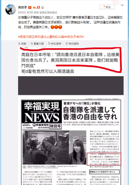 最近、ある日本の政党の出版物に、私の名を騙って、私が「自衛隊に香港を助けてほしい」と主張していると書かれていました。